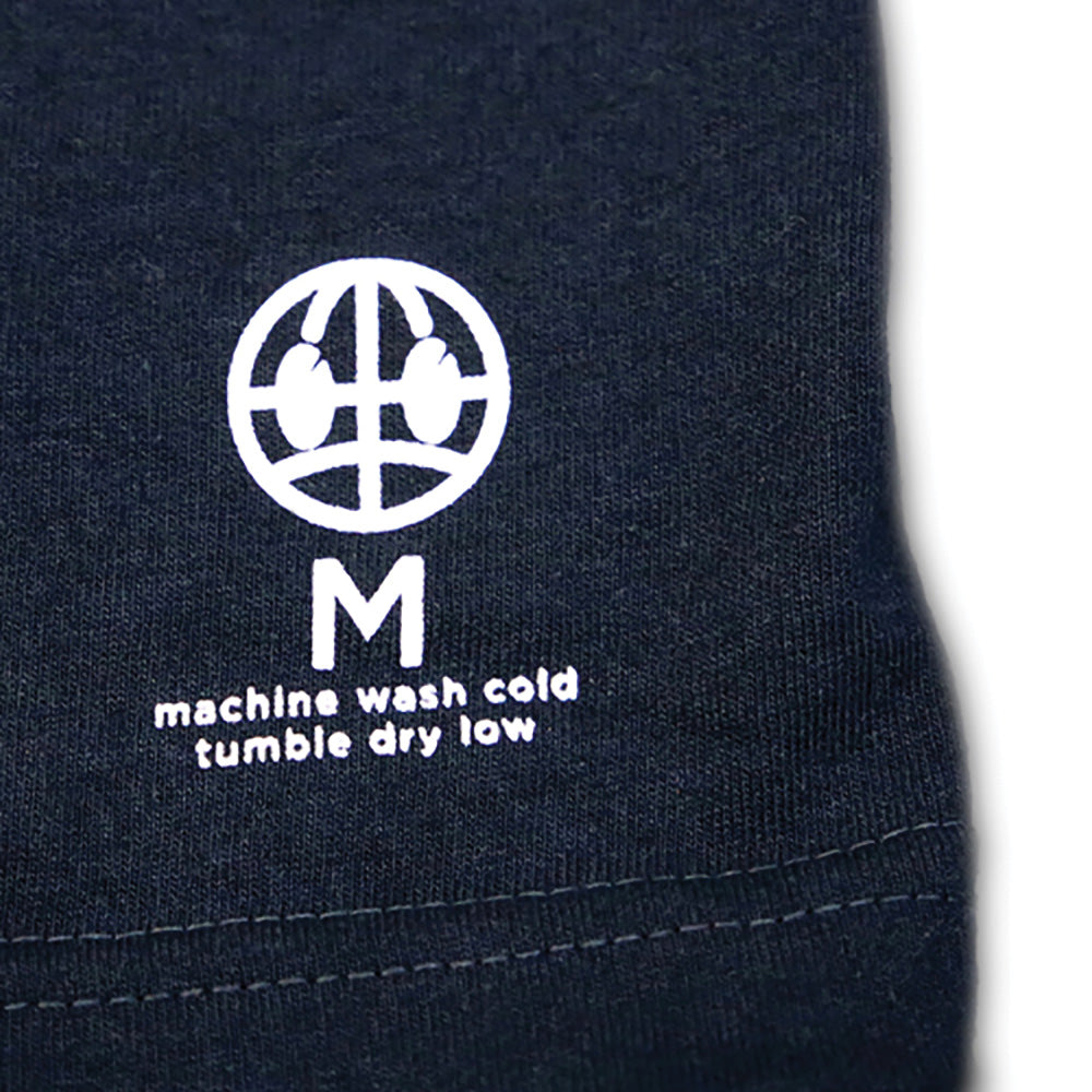 Navy blue tee with white screen printed BOLLEGE graphic.