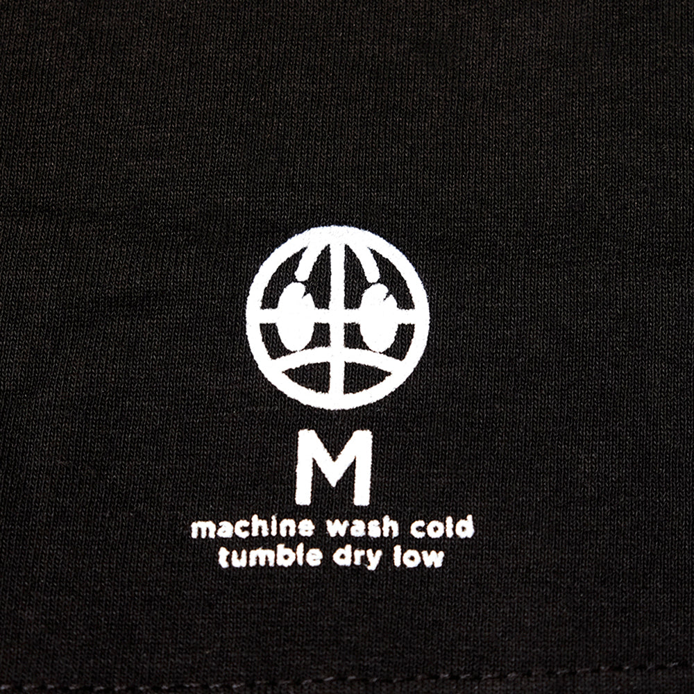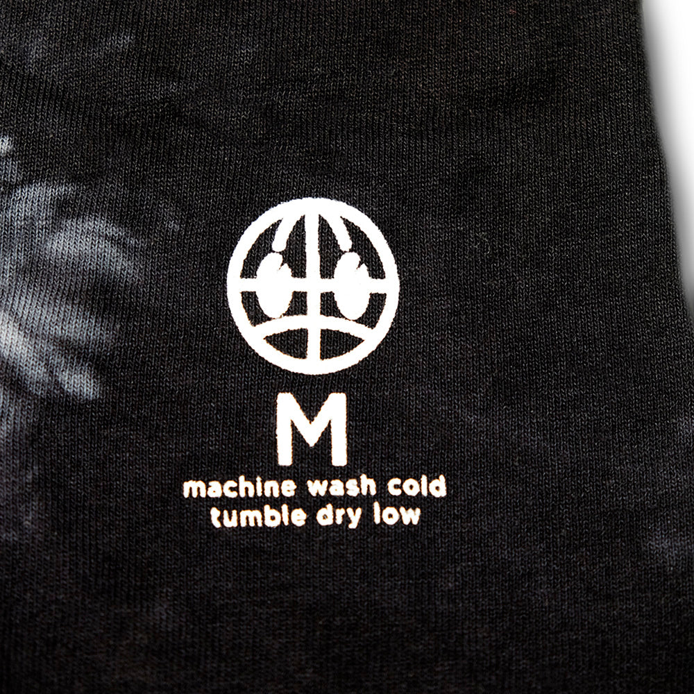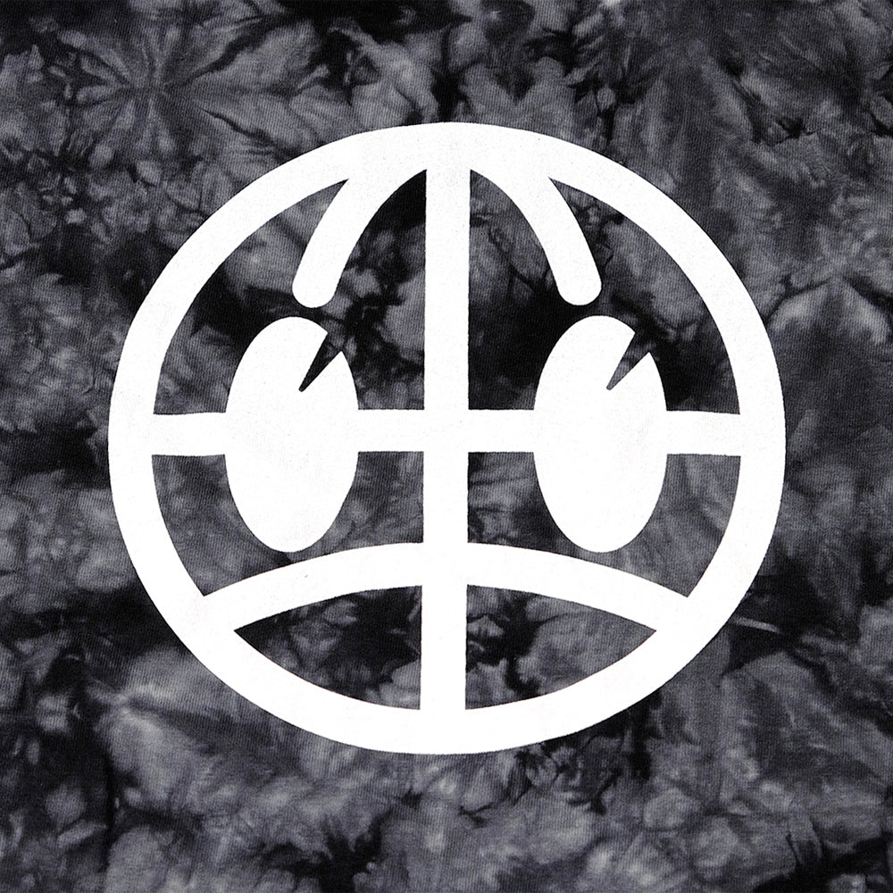 A black & blue tie dyed tee with white screen printed GLOBO graphic